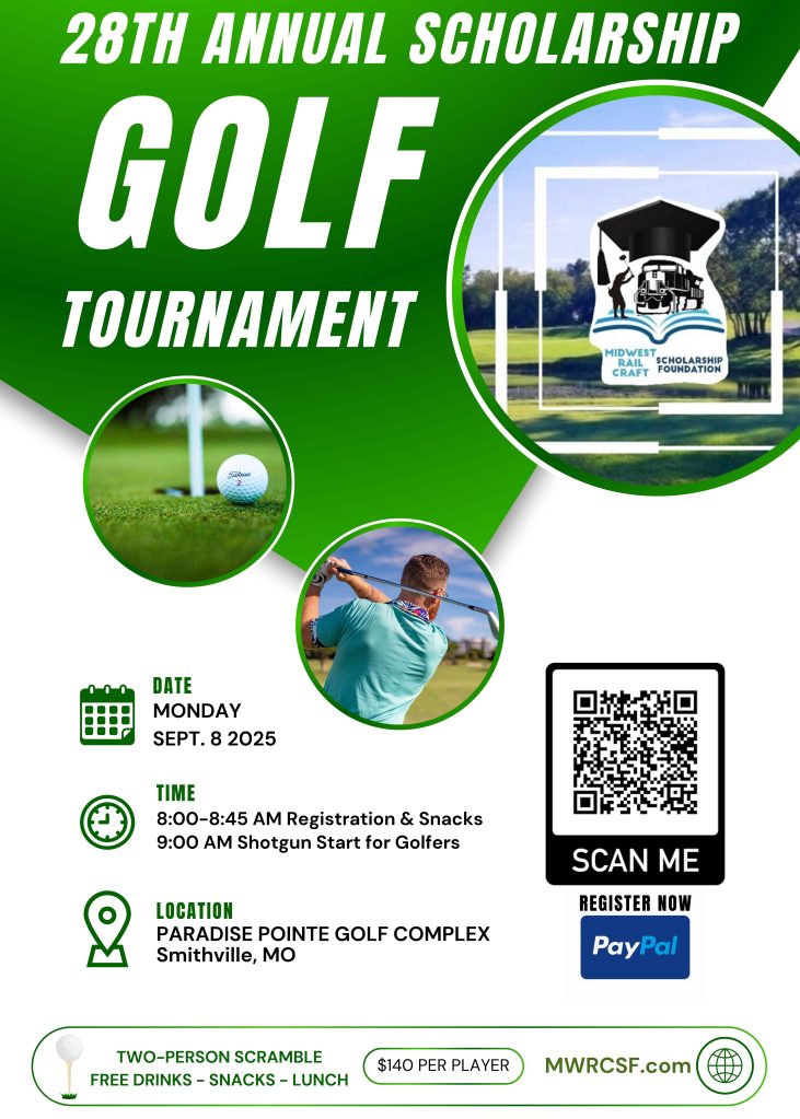 The 28th annual MWRCSF Golf Tournament will be held at the Paradise Pointe Golf Complex near Smithville, MO. Two-Person 18-hole Scramble tees off at 9:00 am, Monday, Sept. 8, 2025.